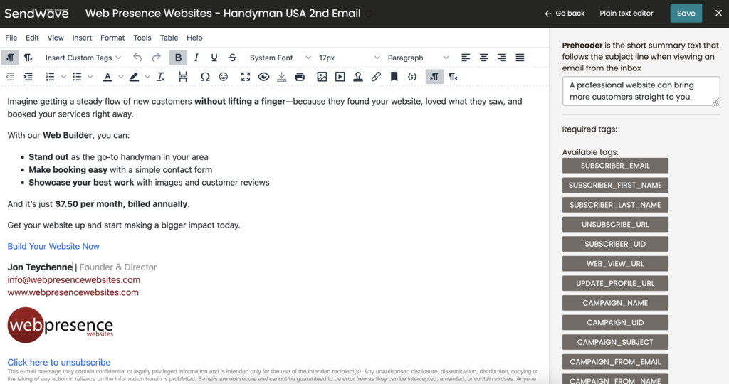 With SendWave’s built-in campaign tracking and analytics, you’ll always know what’s working and what’s not. Monitor email opens, click-through rates, and conversions in real time, then use data-driven insights to optimize future campaigns. A/B test subject lines, refine messaging, and improve targeting to maximize engagement. As your business grows, SendWave scales with you—helping you refine your strategy and drive better results with every send.